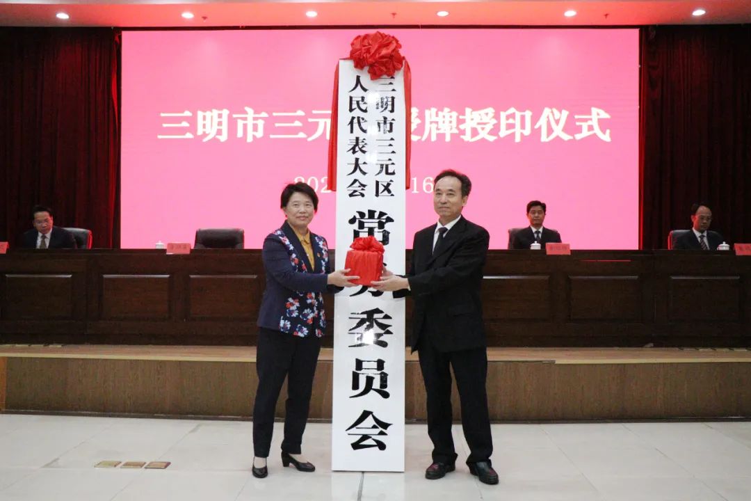 三明市人大常委會(huì)主任詹積富向三元區(qū)人大常委會(huì)主任張淑華授“三明市三元區(qū)人民代表大會(huì)常務(wù)委員會(huì)”銜牌及印章。