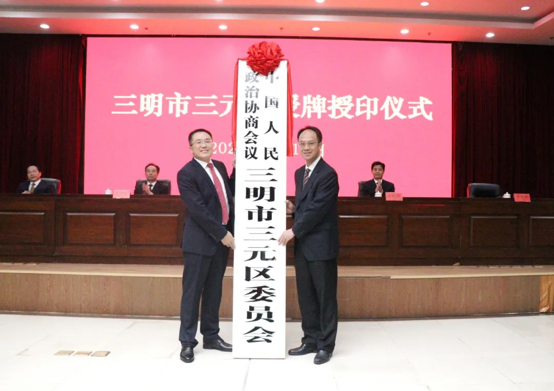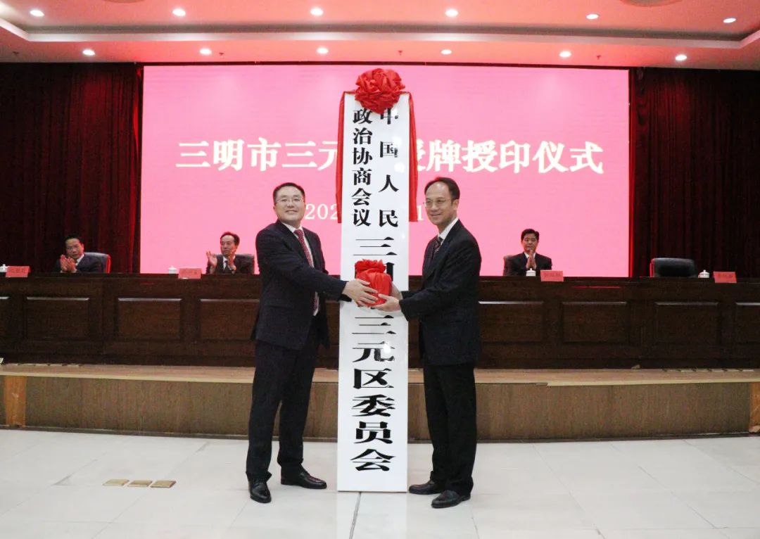 三明市政協(xié)主席黃鶴麟向三元區(qū)政協(xié)主席李世福授“中國人民政治協(xié)商會(huì)議三明市三元區(qū)委員會(huì)”銜牌及印章。