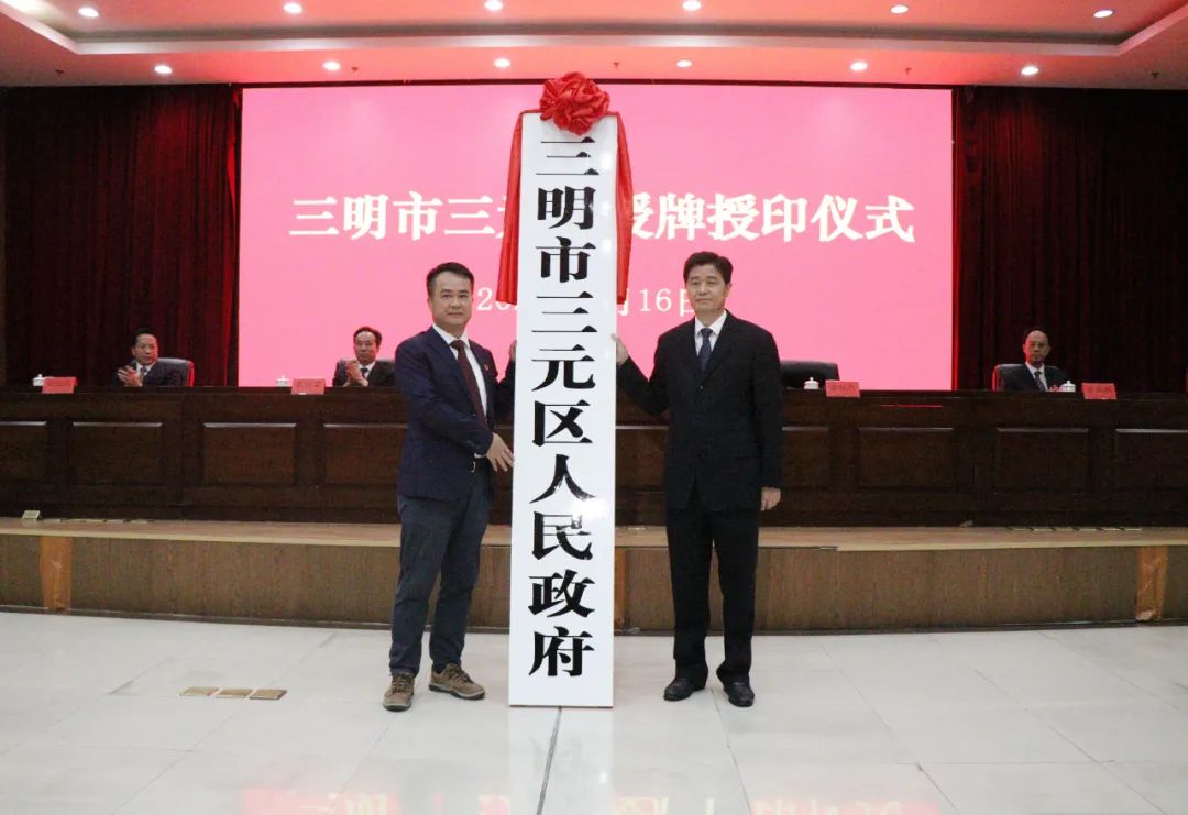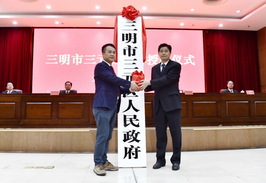 三明市政府市長余紅勝向三元區(qū)政府區(qū)長肖世龍授“三明市三元區(qū)人民政府”銜牌及印章。