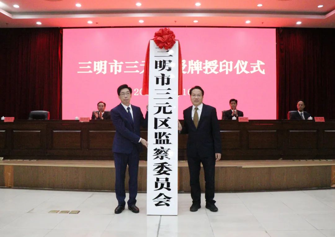 三明市委常委、市紀(jì)委書記、市監(jiān)委主任祝榮亮向三元區(qū)委常委、區(qū)紀(jì)委書記、區(qū)監(jiān)委主任楊通盛授“中國共產(chǎn)黨三明市三元區(qū)紀(jì)律檢查委員會(huì)”“三明市三元區(qū)監(jiān)察委員會(huì)”銜牌。