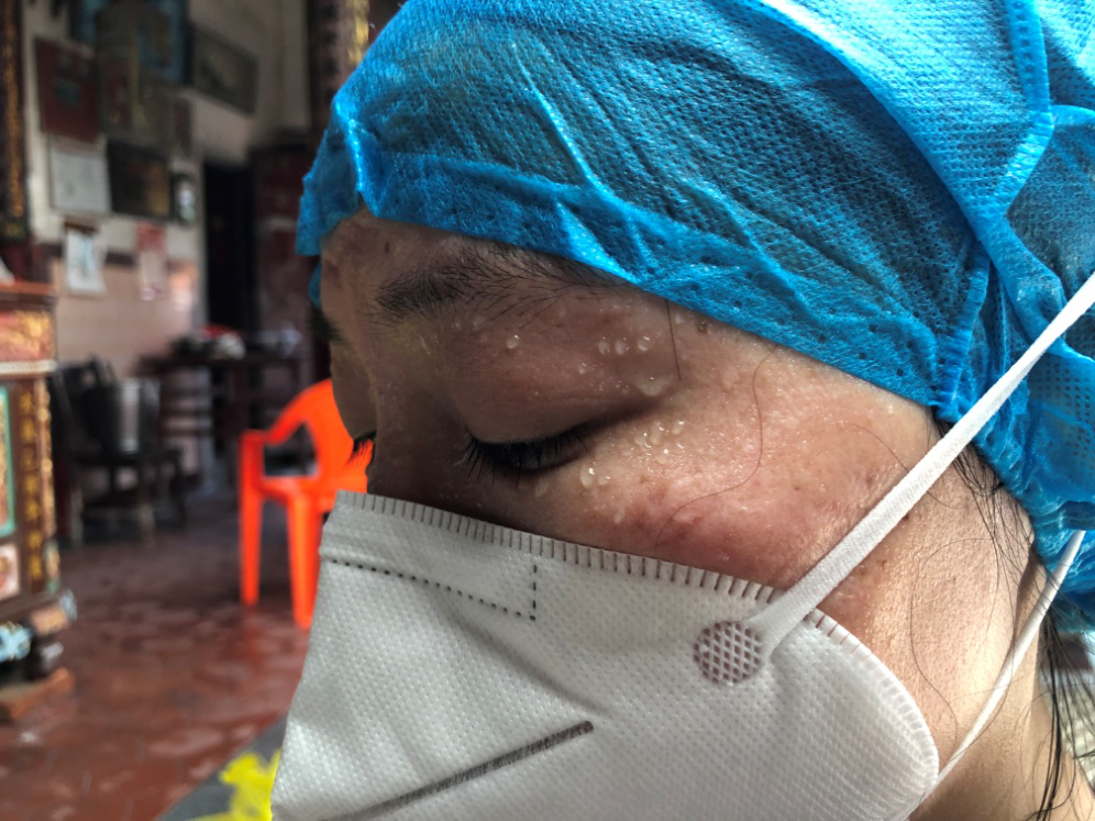 她們頂著烈日,穿著密不透風(fēng)的防護(hù)服,一遍又一遍地做著采樣動(dòng)作,被汗水浸濕的衣服從沒干過,本就不合身的防護(hù)服變得格外笨重......