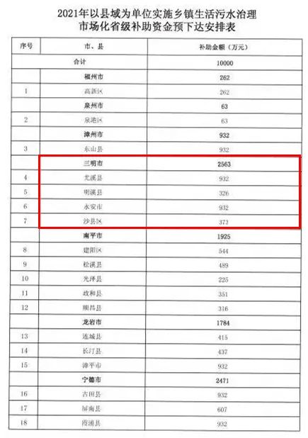 近日,省上下?lián)苋?021年以縣域為單位實施鄉(xiāng)鎮(zhèn)生活污水治理市場化省級補助資金共計1億元。三明市沙縣、永安、明溪、尤溪等4個縣(市、區(qū))列入補助名單,共計獲得補助資金2563萬元,居全省首位。