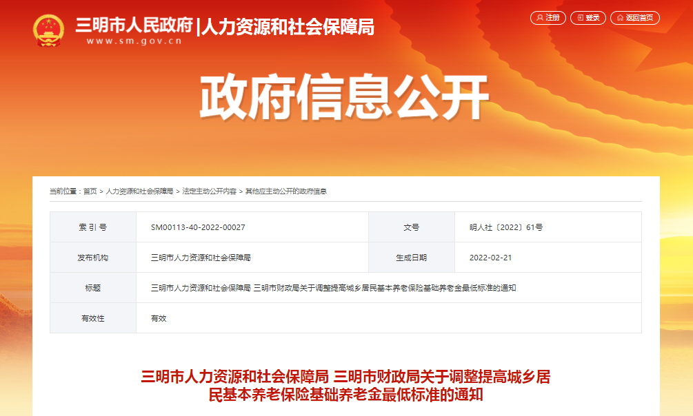 三明市人力資源和社會(huì)保障局 三明市財(cái)政局關(guān)于調(diào)整提高城鄉(xiāng)居民基本養(yǎng)老保險(xiǎn)基礎(chǔ)養(yǎng)老金最低標(biāo)準(zhǔn)的通知
