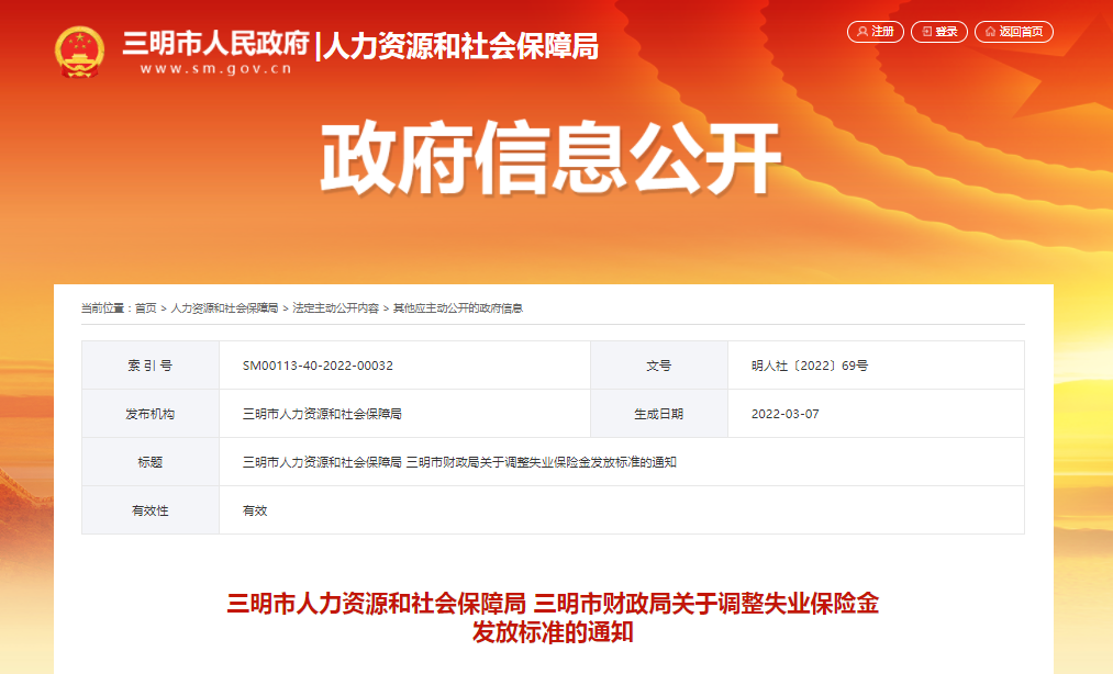 三明市人力資源和社會(huì)保障局 三明市財(cái)政局關(guān)于調(diào)整失業(yè)保險(xiǎn)金發(fā)放標(biāo)準(zhǔn)的通知
