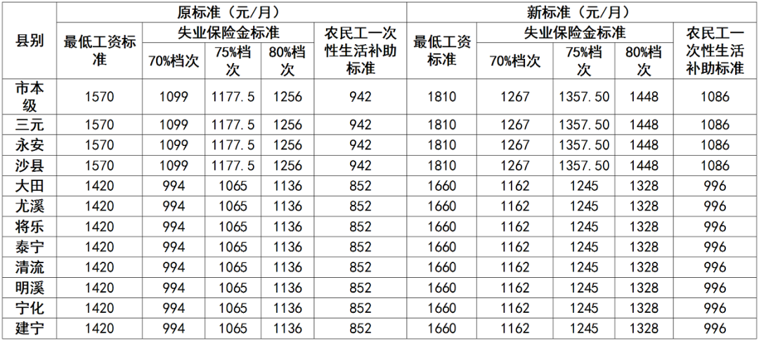 三明市失業(yè)保險(xiǎn)金標(biāo)準(zhǔn)調(diào)整一覽表