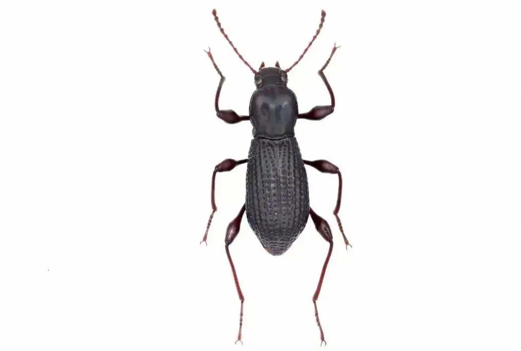 天寶巖腫腿迷甲為昆蟲(chóng)綱鞘翅目擬步甲科昆蟲(chóng),體長(zhǎng)約16mm,體型扁平,雌蟲(chóng)黑色而雄蟲(chóng)暗棕色。頭部較小,與前胸密接??谄靼l(fā)達(dá),上顎大。觸角11節(jié)。前胸背板發(fā)達(dá),側(cè)緣溝薄而深。成蟲(chóng)夜間在樹(shù)干上活動(dòng),白天則隱藏在樹(shù)下或樹(shù)皮中很難找到。