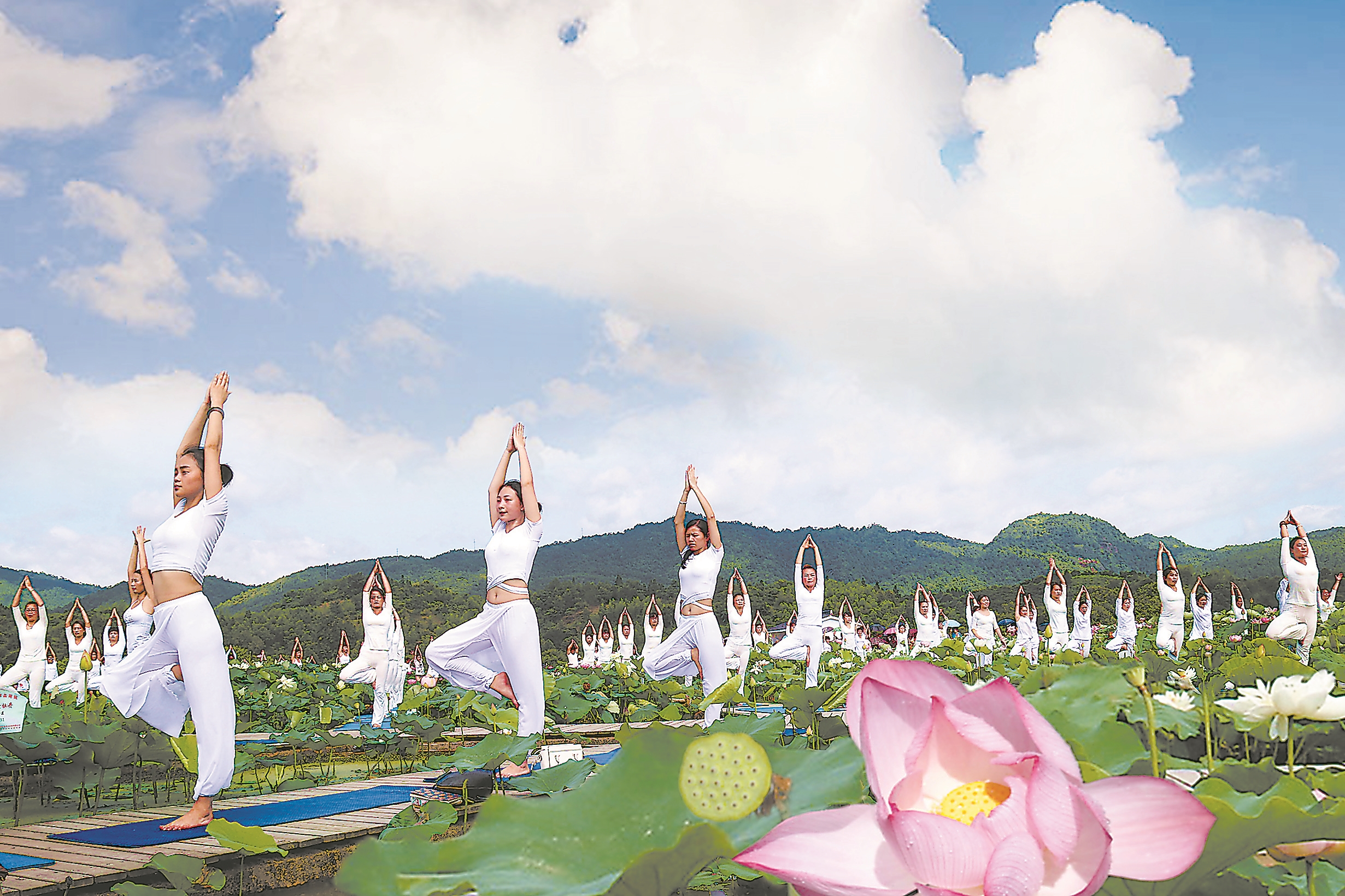 在建寧縣修竹荷苑景區(qū)進(jìn)行的瑜伽表演,清新唯美。