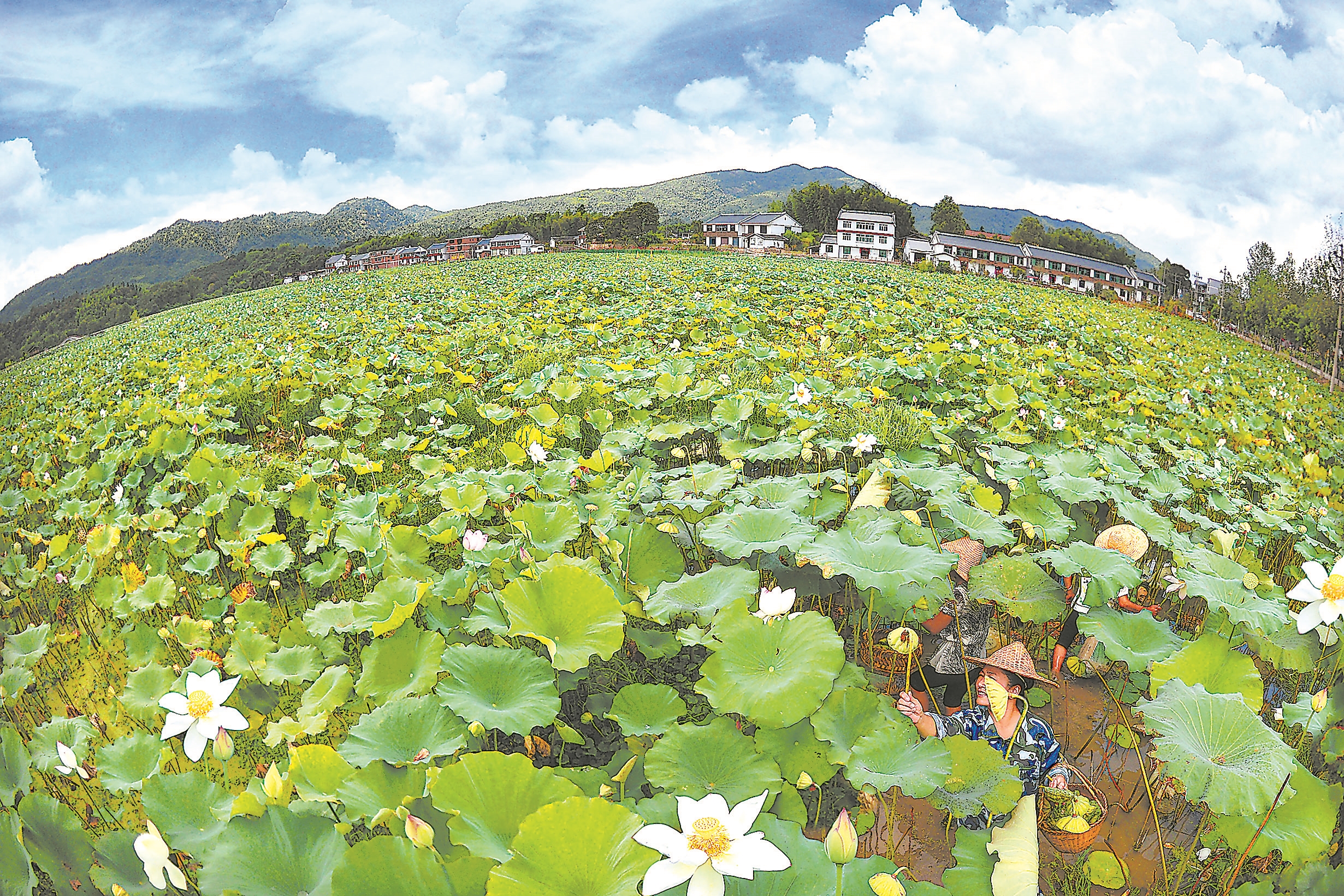 在建寧縣濉溪鎮(zhèn)高峰村蓮田里,蓮農(nóng)在采摘蓮蓬。