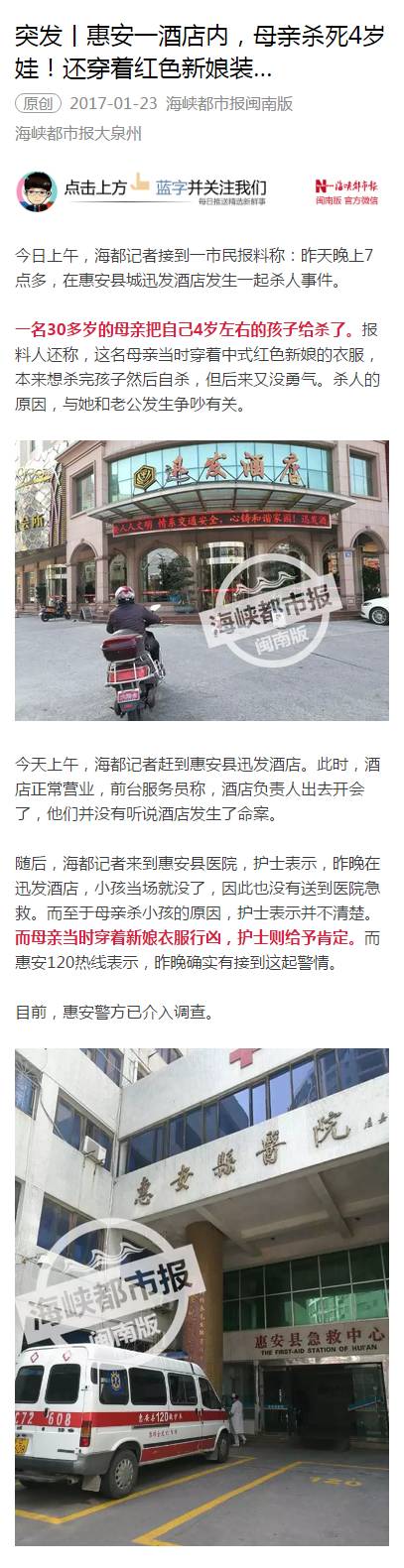 所謂虎毒不食子,一名母親竟然在酒店內(nèi),親手殺死4歲的孩子!事發(fā)后,惠安警方便介入調(diào)查,并于今日下午4點(diǎn)半左右通報案情↓↓