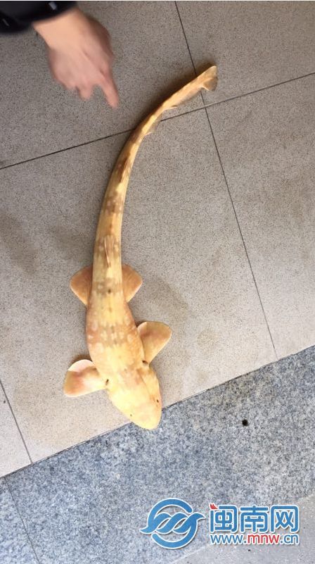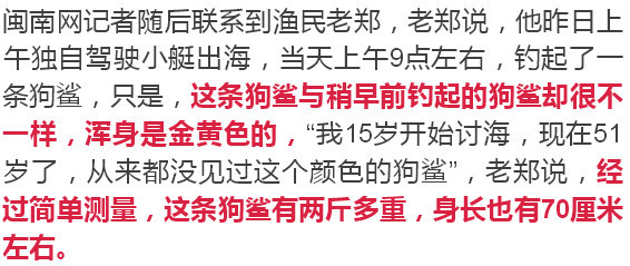 臺海網(wǎng)1月26日訊 據(jù)海峽都市報報道,近日,泉州南安石井的鄭先生向閩南網(wǎng)報料,他們村的漁民老鄭在圍頭灣釣魚時,釣到一條金黃色的狗鯊,大伙看過之后,都覺得很特別。