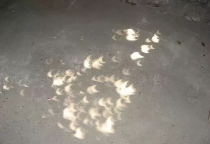 發(fā)生日食的時候,樹蔭的縫隙會成為天然的小孔,在樹蔭底下的小亮點都是太陽的小孔成像。