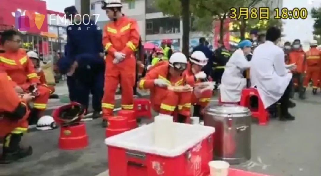 【18 : 00】天逐漸黑了,新一批輪換下來的消防官兵抓緊時間吃晚飯,隨后繼續(xù)加入到救援大部隊中。