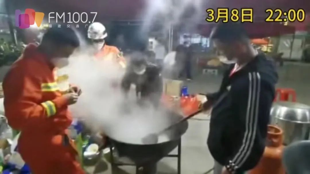 【20 : 45】志愿者在現場支起鍋,煮起了熱騰騰的姜湯,讓救援隊員暖和身子。