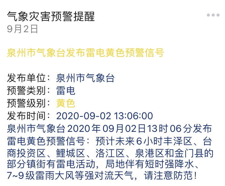 泉州市氣象臺2020年09月02日13時06分發(fā)布雷電黃色預(yù)警信號:預(yù)計未來6小時豐澤區(qū)、臺商投資區(qū)、鯉城區(qū)、洛江區(qū)、泉港區(qū)和金門縣的部分鎮(zhèn)街有雷電活動,局地伴有短時強(qiáng)降水、7~9級雷雨大風(fēng)等強(qiáng)對流天氣,請注意防范!