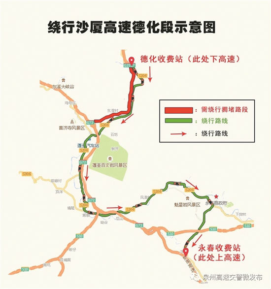 沙廈高速安溪龍門至廈門路段195公里至213公里,沙廈龍門段擁堵可從龍門收費(fèi)站下高速,繞行206省道至廈門。需要通過(guò)沙廈高速德化段三明往泉州方向即德化連接線的車輛,可駕駛到臨近德化收費(fèi)站時(shí)從德化出口分流,走省道206線到永春岵山,再?gòu)娜细咚儆来菏召M(fèi)站入口上高速公路,可避開特殊路段,以免擁堵。