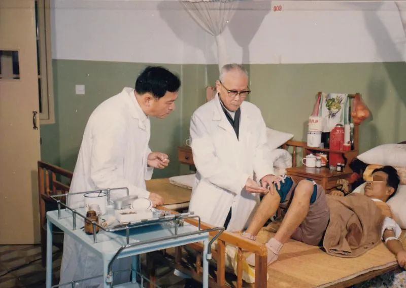 △上世紀(jì)80年代,留章杰(中)在病房為患者施針