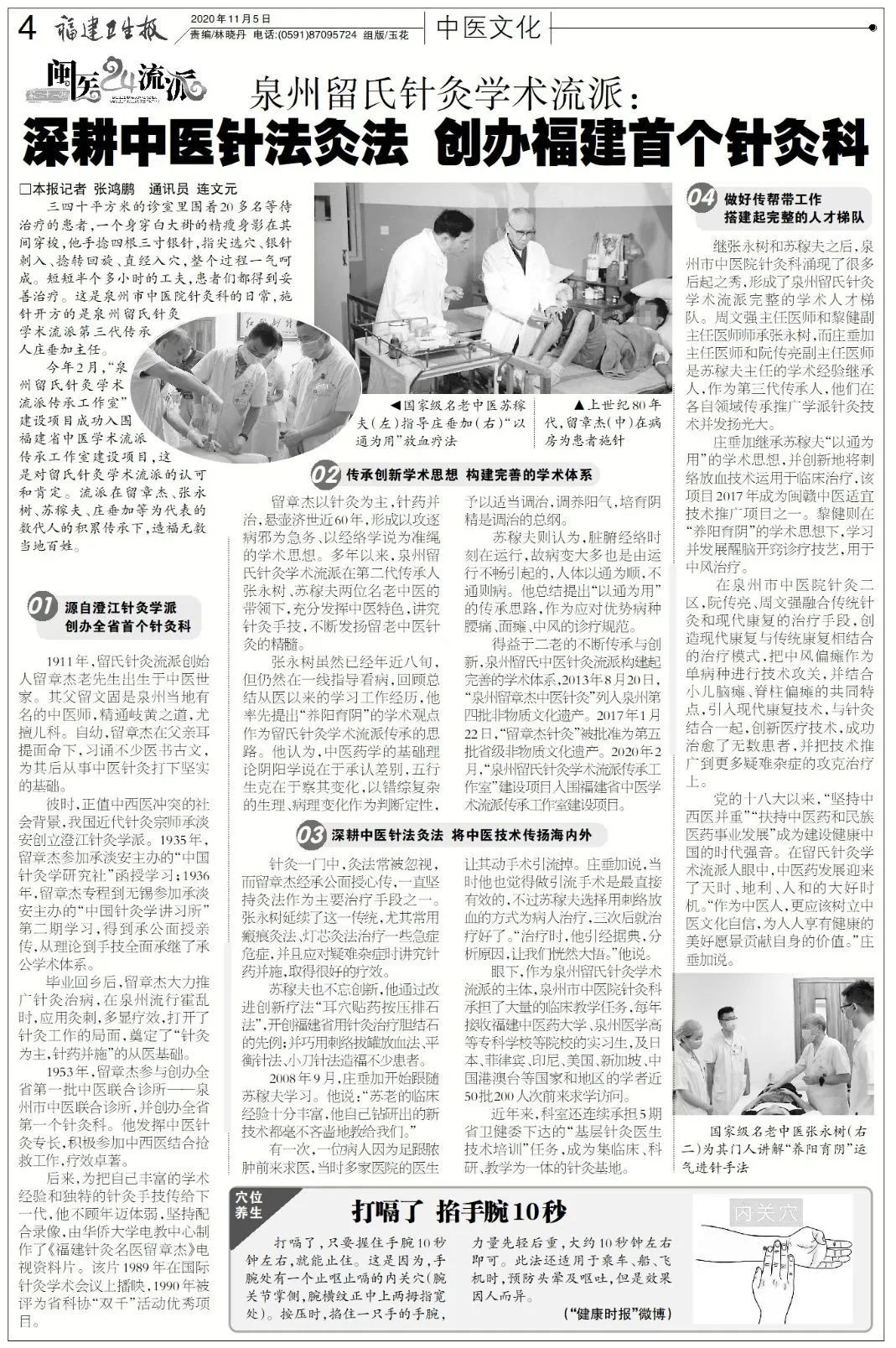 短短半個多小時的工夫,患者們都得到妥善治療。這是泉州市中醫(yī)院針灸科的日常,施針開方的是泉州留氏針灸學(xué)術(shù)流派第三代傳承人莊垂加主任。