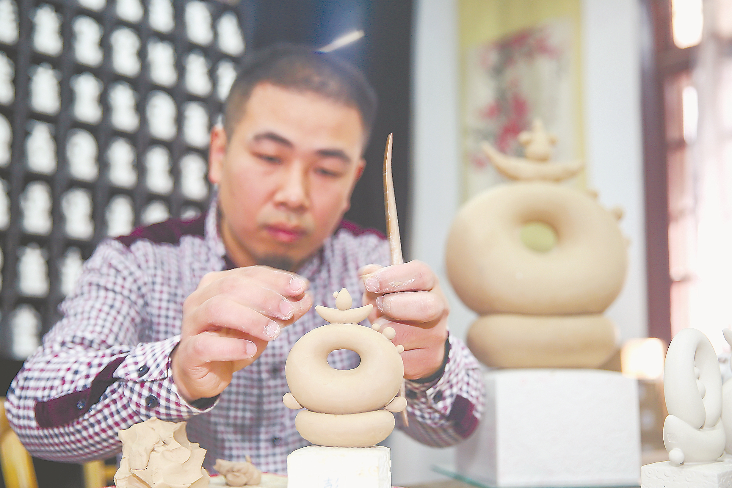 彭成雄在創(chuàng)作白瓷立體漢字。