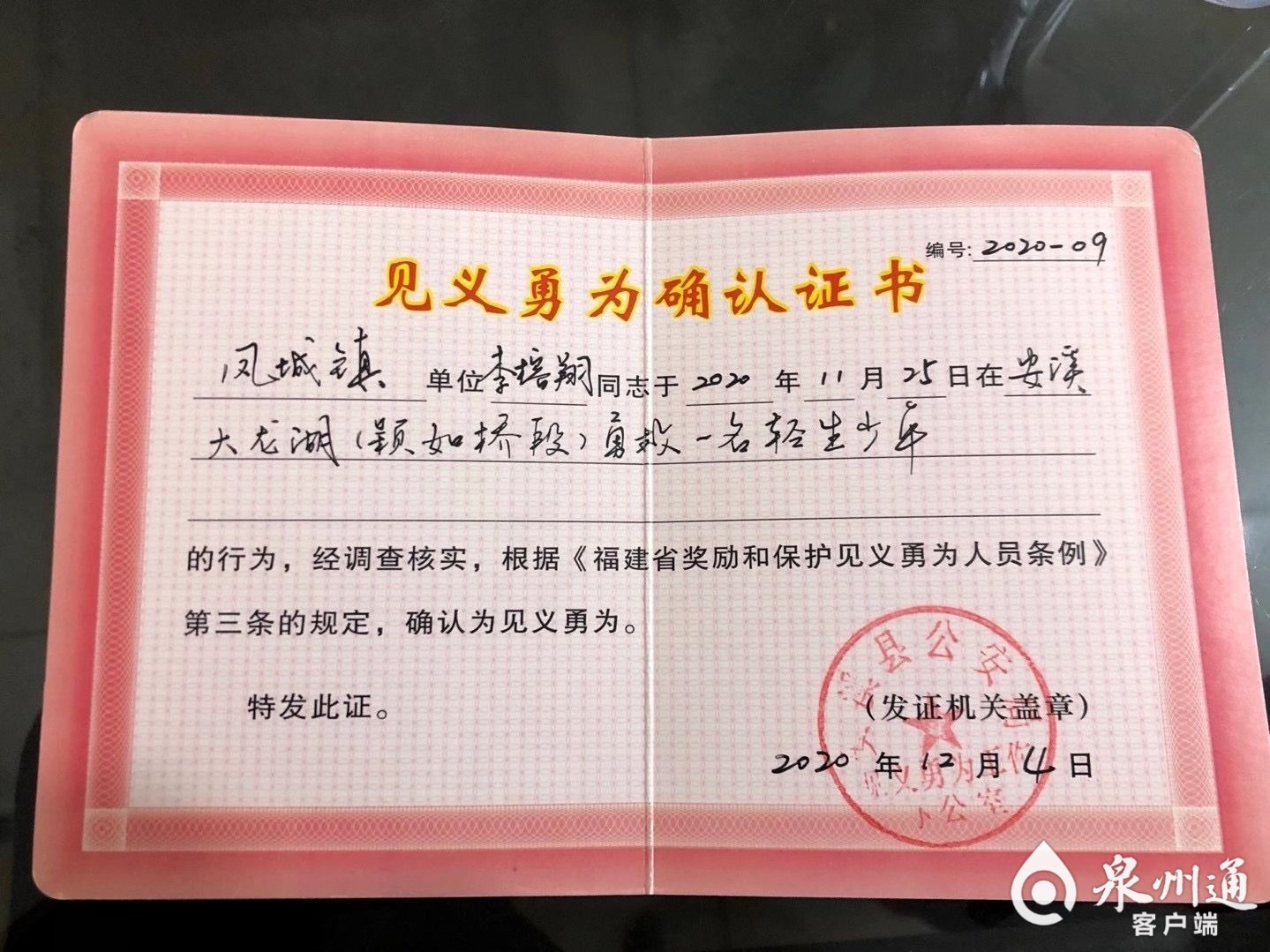 臺海網(wǎng)12月11日訊 據(jù)泉州通客戶端報道 “誰都有遇到困難的時候,下次再遇見這種事我一定還會沖上去的。”33歲的安溪人李榕翔如是說。近日,泉州晚報報道了他勇救落水少年的事跡,在十里八鄉(xiāng)廣為流傳。記者獲悉,日前安溪警方已將“見義勇為確認(rèn)證書”送到李榕翔手上,以表彰他的善舉。