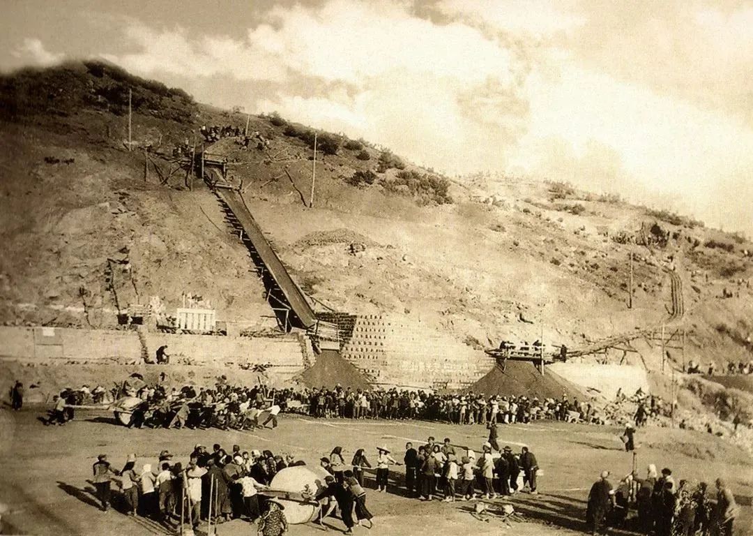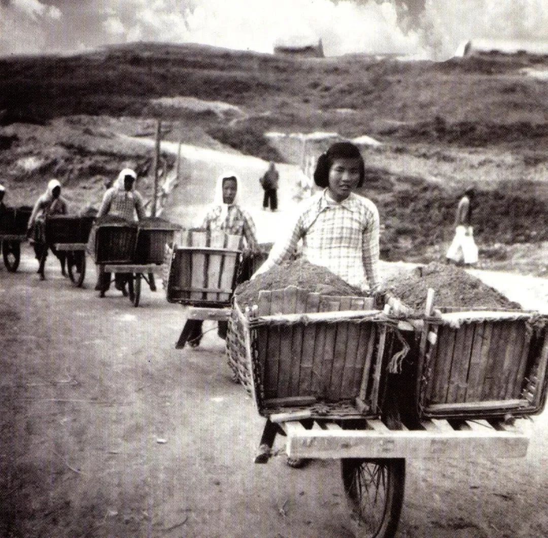 ▲惠安女們用獨(dú)輪車(chē)為壩基運(yùn)送土方。