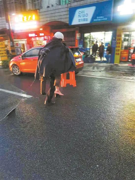 “我的右腳動(dòng)不了了。”男子頭戴安全頭盔,身披一件雨衣,痛苦地說。