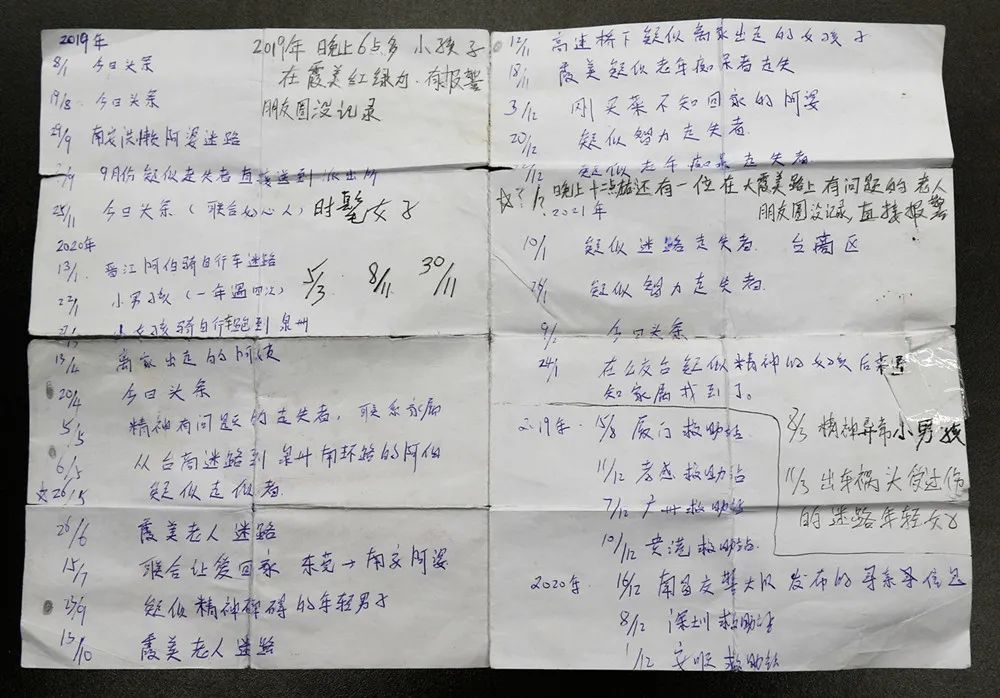 他告訴記者,A4紙上有27人是他在送餐途中遇見(jiàn)的走失者;剩下的7人,是他通過(guò)“頭條尋人”的人臉識(shí)別系統(tǒng),將各地救助站發(fā)布的尋親信息和走失者親屬發(fā)布的尋人啟示進(jìn)行比對(duì)后,通過(guò)他遠(yuǎn)程聯(lián)系、找到親人并回歸家庭的走失者。通過(guò)線上尋人,洪成木的尋人地圖從56平方千米的霞美鎮(zhèn)擴(kuò)大到了安順、廣州、深圳、孝感等地。