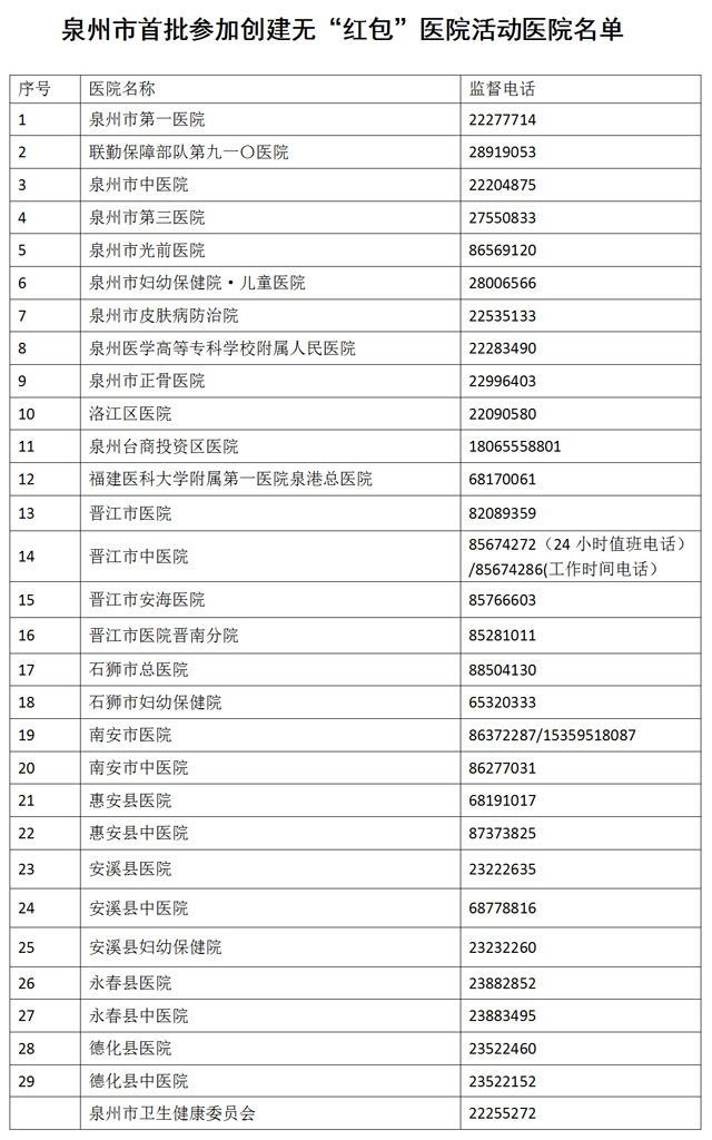 根據(jù)《泉州市創(chuàng)建無“紅包”醫(yī)院活動工作方案》,各地各醫(yī)療機構將以一個公開承諾、一封致患者的信、一個就診提醒、一張住院知情同意書、一次出院回訪“五個一”為載體,公開承諾創(chuàng)建無“紅包”醫(yī)院,加大宣傳力度,引導患者及家屬不送“紅包”。暢通監(jiān)督渠道,自覺接受社會各界監(jiān)督,推動醫(yī)患雙方和工作人員自覺抵制“紅包”。