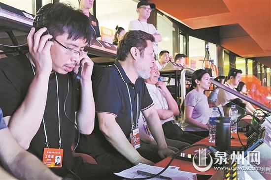 6月28日,蔡燦煌(左一)在晚會總控臺控制焰火燃放(林毅/攝)