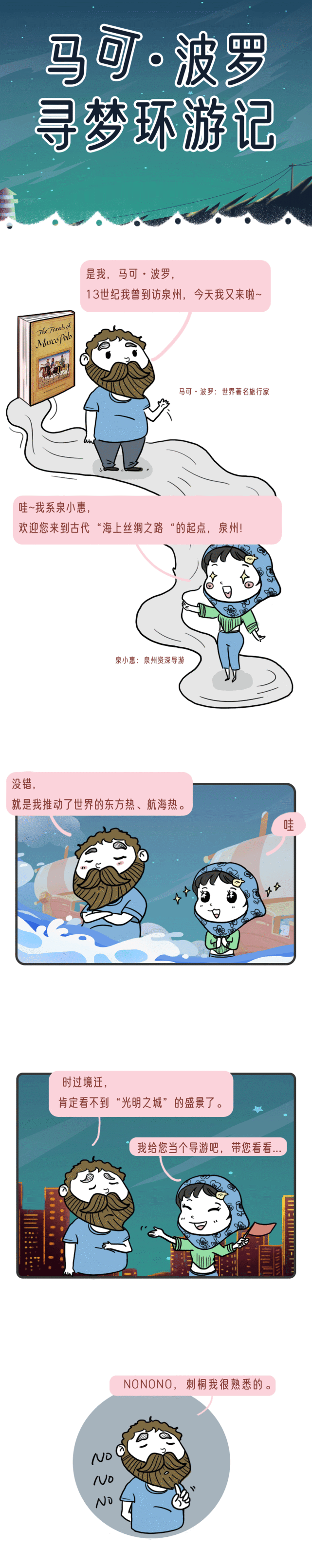 這個(gè)游客名氣很大,他說(shuō)的話(huà)在西方世界很有分量。他是個(gè)意大利人,名叫做馬可·波羅。1271年,17歲的馬可·波羅,懷著對(duì)神秘東方的向往,跟隨父親與叔叔,從家鄉(xiāng)威尼斯出發(fā)了,也開(kāi)啟了他與泉州的不解之緣。
