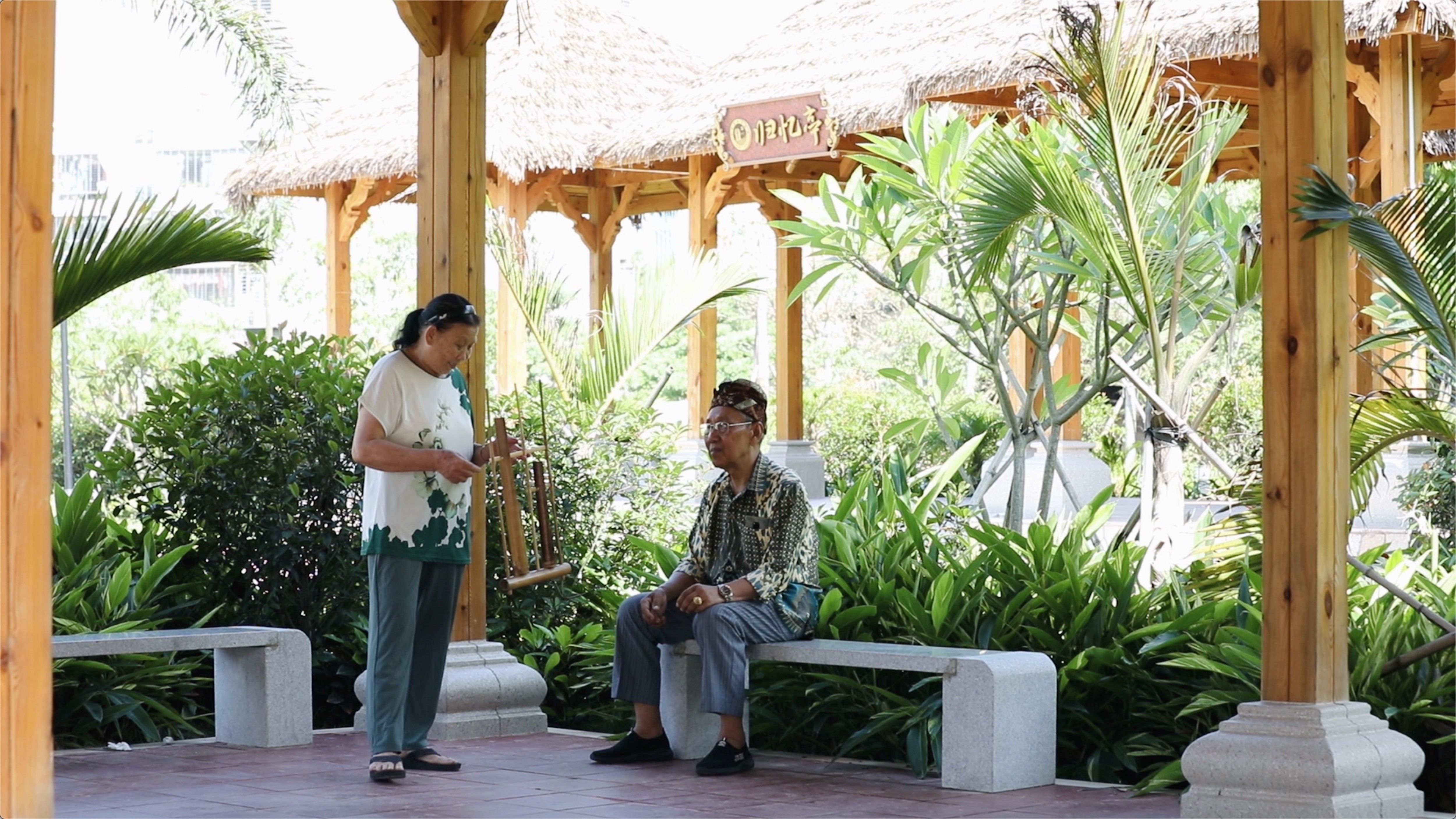 蔡金基(右)和社區(qū)文藝隊(duì)成員正在社區(qū)的民俗文化園內(nèi)聊天。新華社記者 陳旺 攝