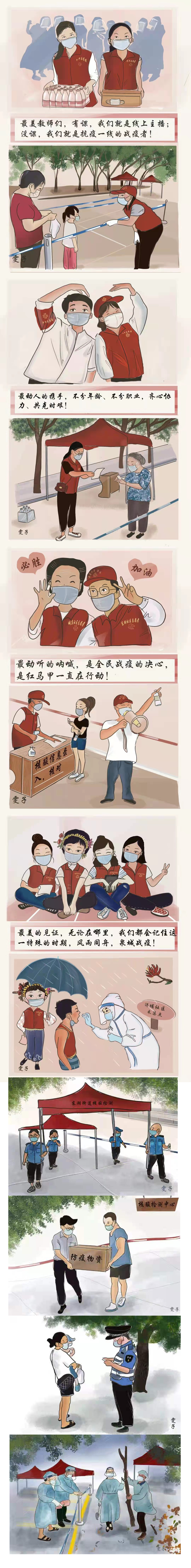 陳雯雯是豐澤區(qū)教育局的工作人員,她踴躍報名,到防疫現(xiàn)場做志愿者。“靈感都來源于真實的場景。在現(xiàn)場看到了很多感人的畫面,不禁想用畫筆畫下來。”陳雯雯用了2天的時間畫了十幾幅的抗疫漫畫,其中紅馬甲系列畫了一個晚上, 10個防控疫情一線志愿者的故事都是記錄的真實瞬間。