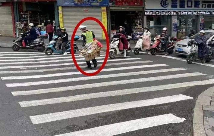 這位交警是在幫助老人挑擔過馬路。
