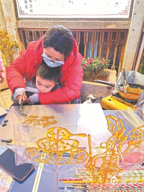 “你想要畫什么圖案?”“想要一只小老虎。”記者來到金魚巷口時(shí),不少家長正帶著孩子圍在制作糖畫的攤位前,等著體驗(yàn)這一非遺技藝。糖畫制作者拉著孩子的手,拿起勺子舀了一勺麥芽糖,輕輕地帶動孩子的手制作糖畫,家長拿起手機(jī)錄起了視頻。不一會兒,一只形象生動的老虎便被勾勒出來。