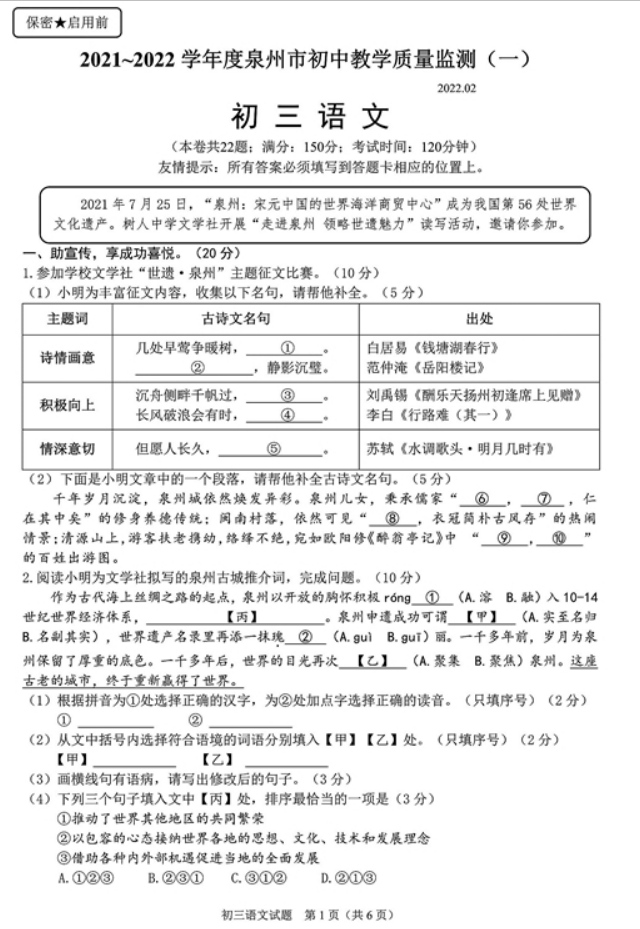 臺海網(wǎng)2月26日訊 據(jù)泉州晚報報道 2月24日,泉州進行2021—2022學(xué)年度初中教學(xué)質(zhì)量監(jiān)測,全市初三學(xué)生作答了一份特殊的語文試卷(部分摘登如下)。這份試卷以“‘泉州:宋元中國的世界海洋商貿(mào)中心’成為我國第56處世界文化遺產(chǎn)”為主題,所有題目以此統(tǒng)籌、串聯(lián)。據(jù)了解,這種“世遺出卷,學(xué)子作答”的命題方式,在我國世遺城市中尚無先例。