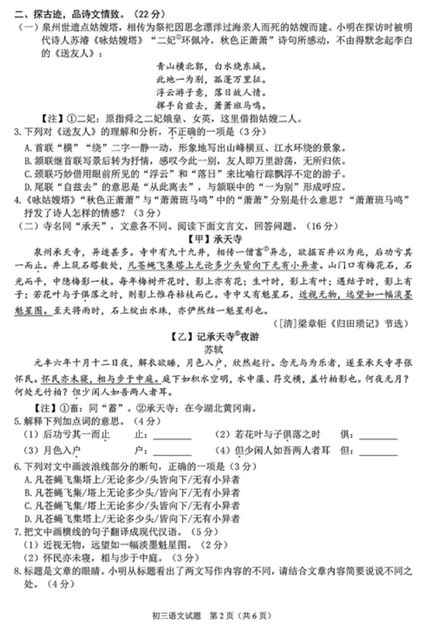 試卷以“走進泉州,領(lǐng)略世遺魅力”為主題,由“助宣傳,享成功喜悅”“探古跡,品詩文情致”“讀美文,賞南音神韻”“觀評論,話古城保護”“搜資料,談刺桐遺風(fēng)”“勤研學(xué),尋名著真味”“寫心得,抒泉州驕傲”七個模塊組成,涉及承天寺、泉州南音、古城保護、22個世界遺產(chǎn)點等內(nèi)容。最后的作文題,讓學(xué)生講述“我與泉州的故事”或“我為泉州來獻言”。