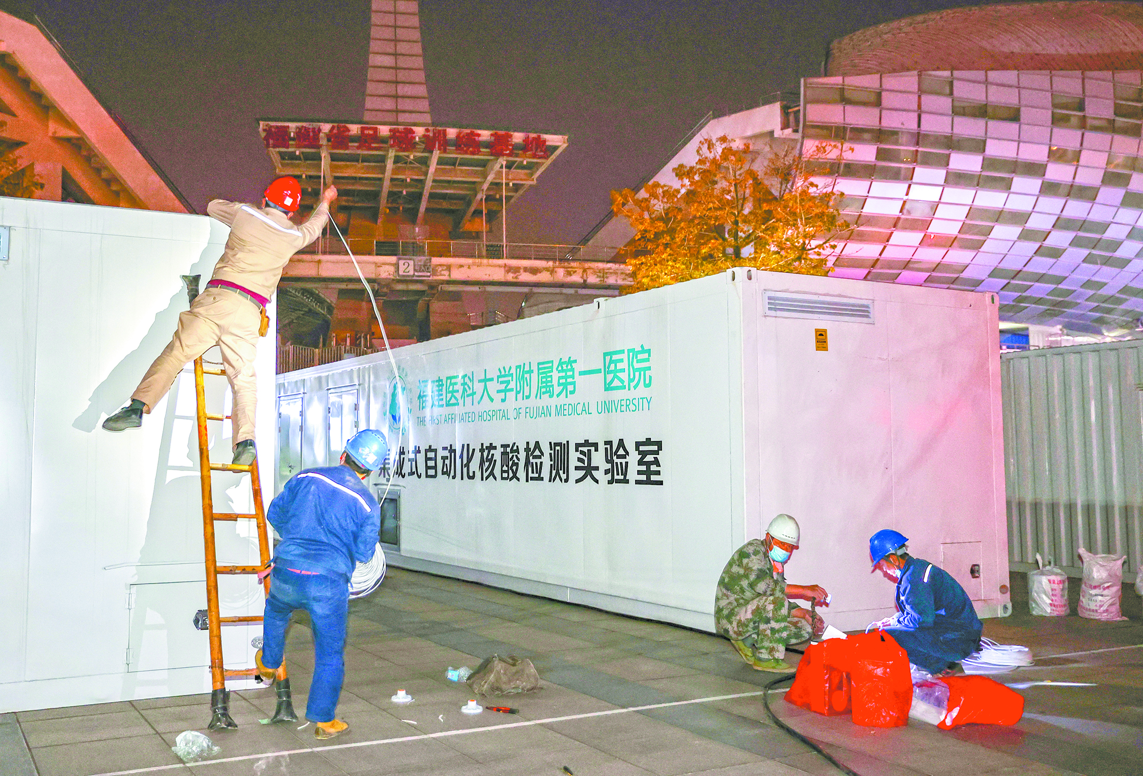3月15日晚9時(shí)許,記者在泉州市海峽體育中心看到,大型調(diào)運(yùn)車輛正在將一個(gè)個(gè)移動(dòng)方艙從掛車上吊起,放置在場地內(nèi)?,F(xiàn)場大型發(fā)電設(shè)備隆隆作響,國網(wǎng)泉州供電公司的工作人員正抓緊為移動(dòng)檢測(cè)方艙實(shí)驗(yàn)室的安裝進(jìn)行供電設(shè)備的連接。在不遠(yuǎn)處,一個(gè)個(gè)已經(jīng)安裝到位的移動(dòng)方艙有序排列,身著隔離服的檢測(cè)人員在各自忙碌著手上的工作。