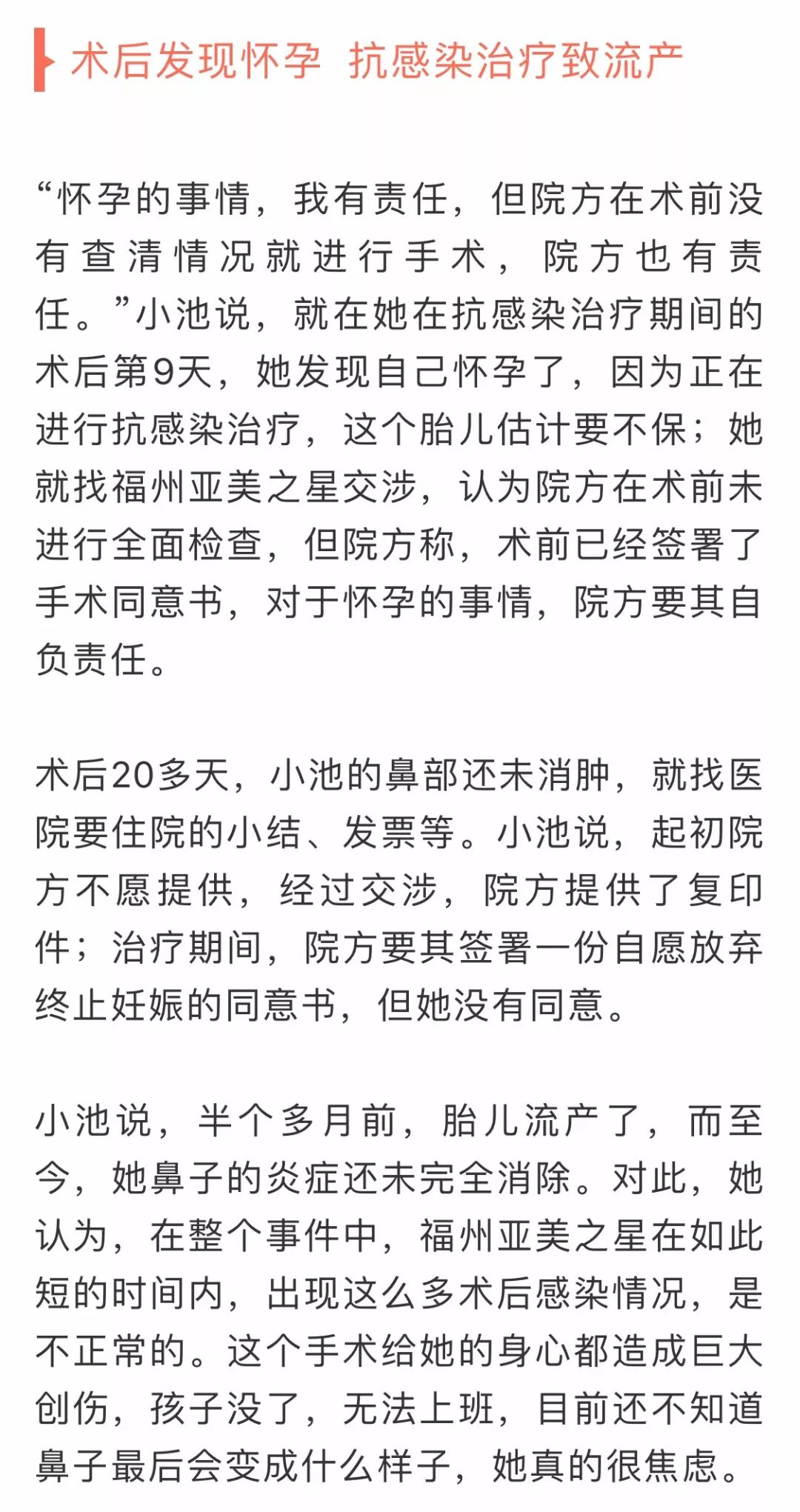 小吳的手術(shù)安排在4月19日,同樣是七天后返回醫(yī)院拆線,但她發(fā)現(xiàn)鼻子出現(xiàn)腫脹,院方告知其“沒事”。但在5月1日,小吳的鼻子出現(xiàn)流血癥狀,醫(yī)生稱,有積液。隨后,小吳進(jìn)行了10天的消炎治療,但癥狀沒有好轉(zhuǎn),她被送到福州一家公立三甲醫(yī)院進(jìn)行治療,癥狀出現(xiàn)好轉(zhuǎn),但還是未消腫。