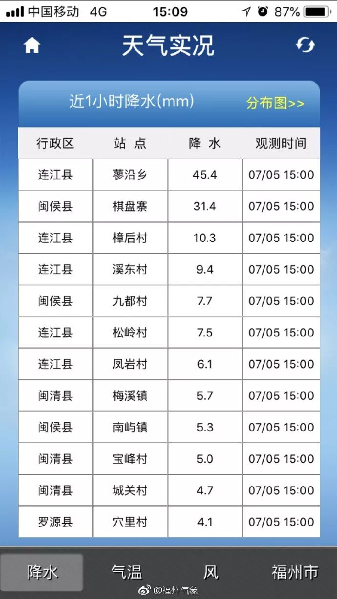據(jù)福州氣象微博,連江蓼沿鄉(xiāng)1小時雨量近50毫米,請注意防范,降雨馬上影響福州市區(qū)啦,記得收衣服喲