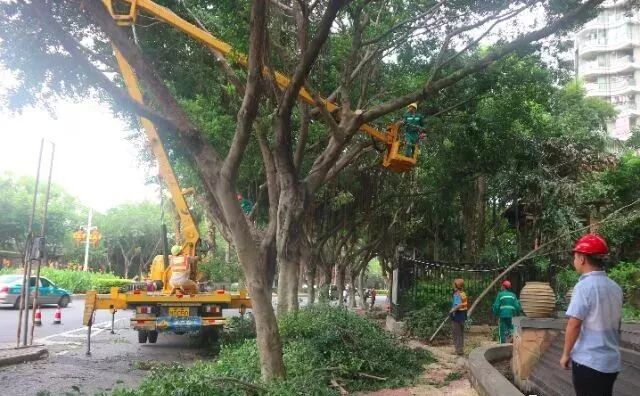 為防抗臺風(fēng)“瑪莉亞”,福州市園林部門積極做好應(yīng)對工作,防止出現(xiàn)意外情況。配圖為7月10日下午,園林工人在修剪江濱西大道的小葉榕。