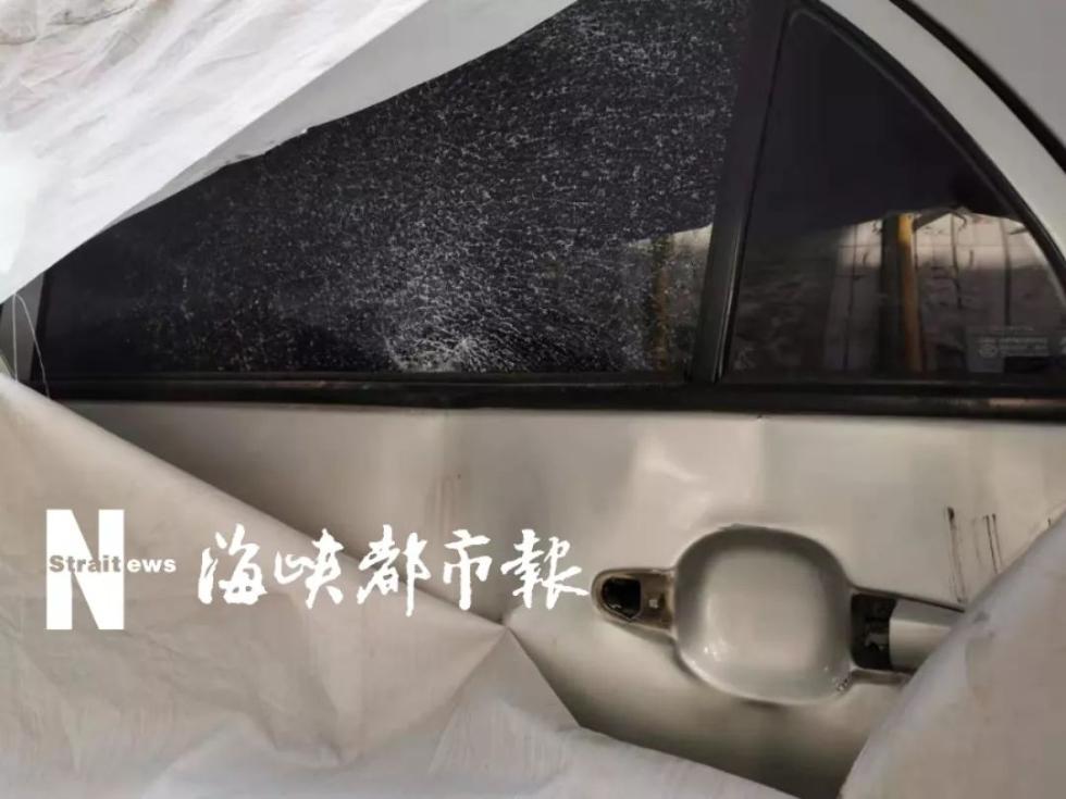 記者透過破損處能清楚地看到,小車的左后車門玻璃及后擋風(fēng)玻璃碎裂,左后車門把手丟失,車門位置還有輕微塌陷 ,周邊并無看到血跡。