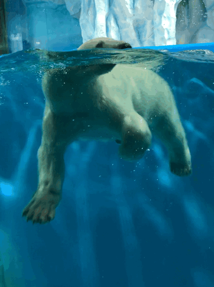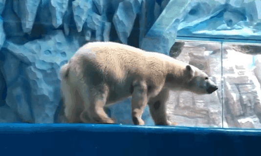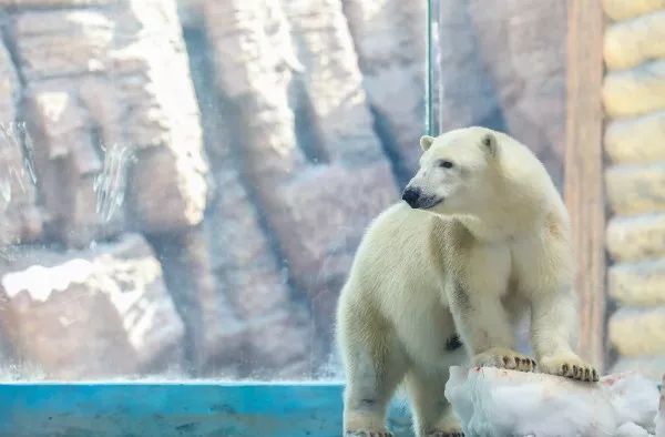 采訪團(tuán)看到,現(xiàn)場的展缸里同時展示著3頭北極熊,龍鳳胎兄妹盧卡和麗莎關(guān)系十分要好,形影不離,每天在一起玩耍。另外一頭叫伊麗娜3歲,是后來加入進(jìn)來的。由于北極熊的天性是獨來獨往,要將它們放在一起展示實際上是經(jīng)過長時間的訓(xùn)練才能做到的。