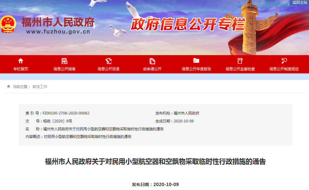 臺(tái)海網(wǎng)10月9日訊 10月9日,福州市政府網(wǎng)站發(fā)布《福州市人民政府關(guān)于對(duì)民用小型航空器和空飄物采取臨時(shí)性行政措施的通告》,決定在第三屆“數(shù)字中國(guó)”建設(shè)峰會(huì)及相關(guān)配套活動(dòng)舉辦期間,對(duì)福州的民用小型航空器和空飄物采取臨時(shí)性行政措施,具體請(qǐng)看!
