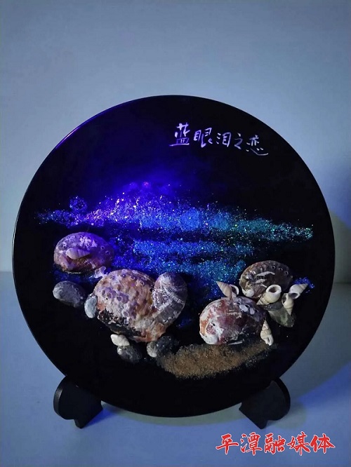 在平潭貝雕館,記者看到此次獲獎的《藍眼淚》主題貝雕主要是以平潭當?shù)氐孽U魚殼作為海邊礁石,再以海沙鋪成沙灘狀,用現(xiàn)代瑩光材料裝飾成“藍眼淚”隨著海浪涌出,最后以精美小貝殼點綴其間,形成極具海島特色風情的藝術(shù)效果。