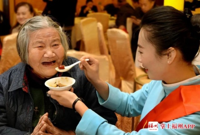 志愿者喂老人吃拗九粥。葉義斌/攝