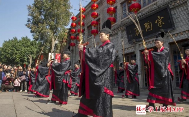 南后街舉行福州非遺項目展演,圖為佾舞展示