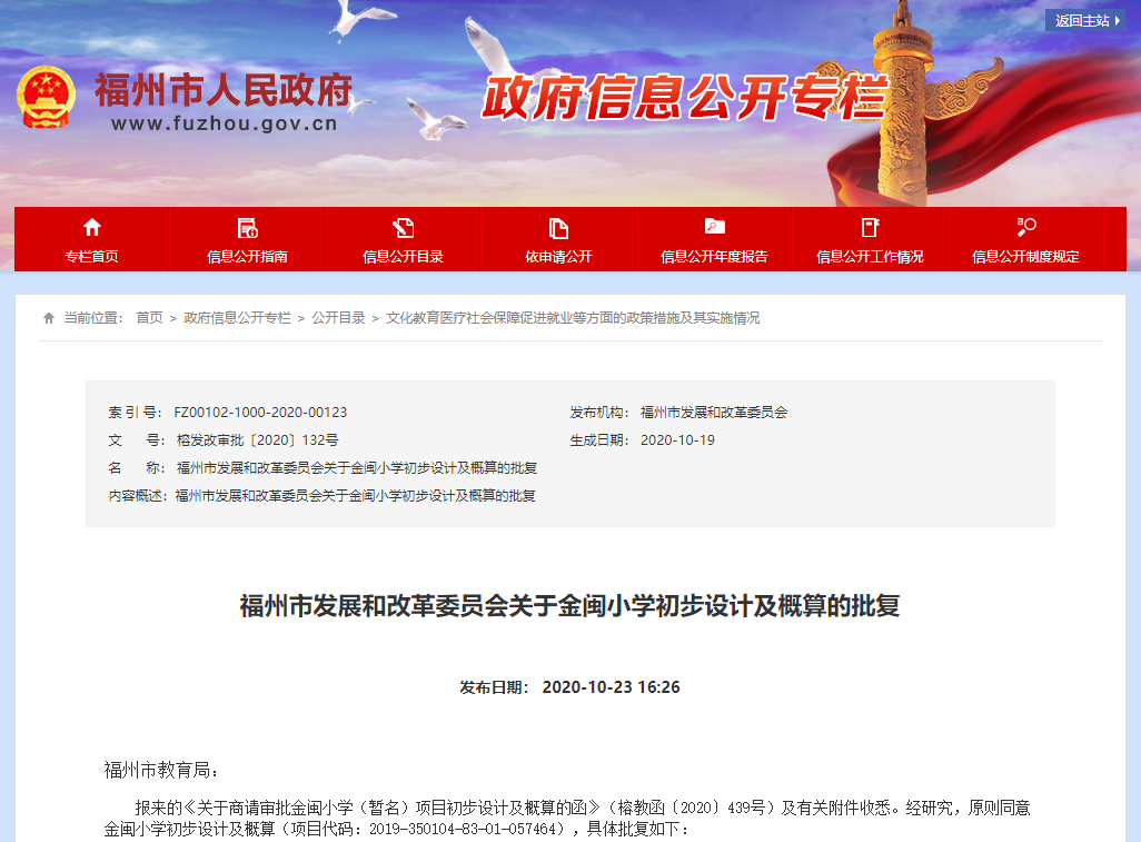 近日,福州市發(fā)改委批復同意了《關于商請審批金閩小學(暫名)項目初步設計及概算的函》。