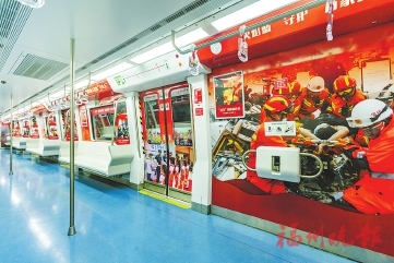 臺海網(wǎng)11月10日訊 據(jù)福州晚報報道 昨日是“119消防宣傳日”,“火焰藍(lán)”號消防主題地鐵專列在福州地鐵1號線上運行。