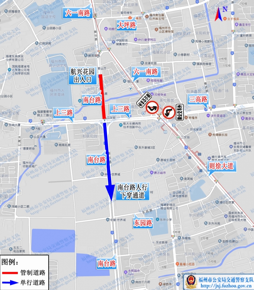 二、南臺(tái)路施工道路(北起南臺(tái)路上三路口,南至南臺(tái)路人行下穿通道口)實(shí)行機(jī)動(dòng)車由北往南單向通行。