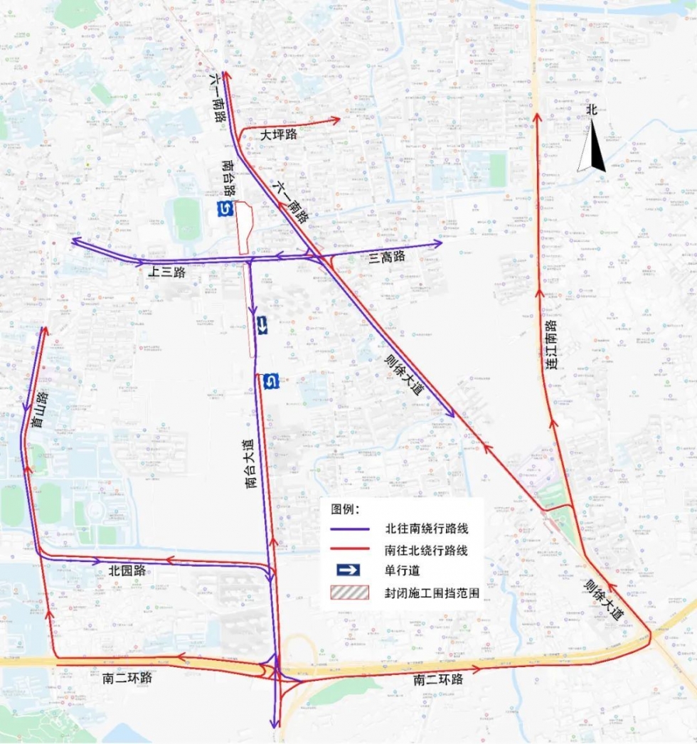 一、南臺(tái)路施工道路(北起南臺(tái)路航興花園出入口,南至南臺(tái)路上三路口)禁止車輛和行人通行。