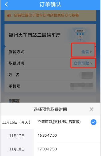 tep3:選擇“堂食/外帶”、設(shè)置取餐時(shí)間